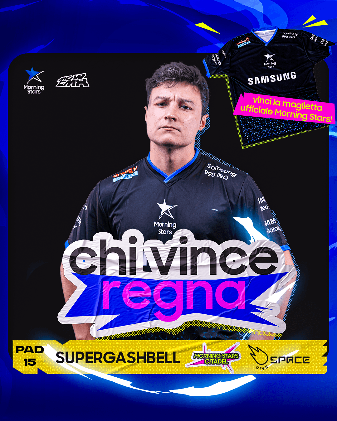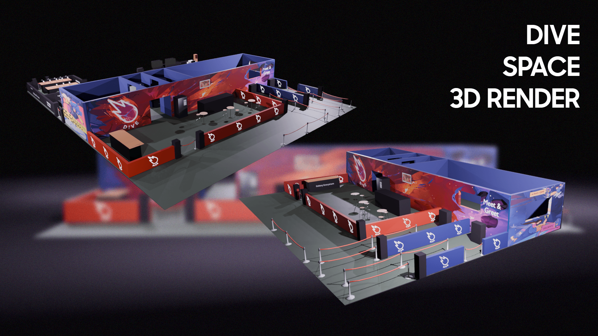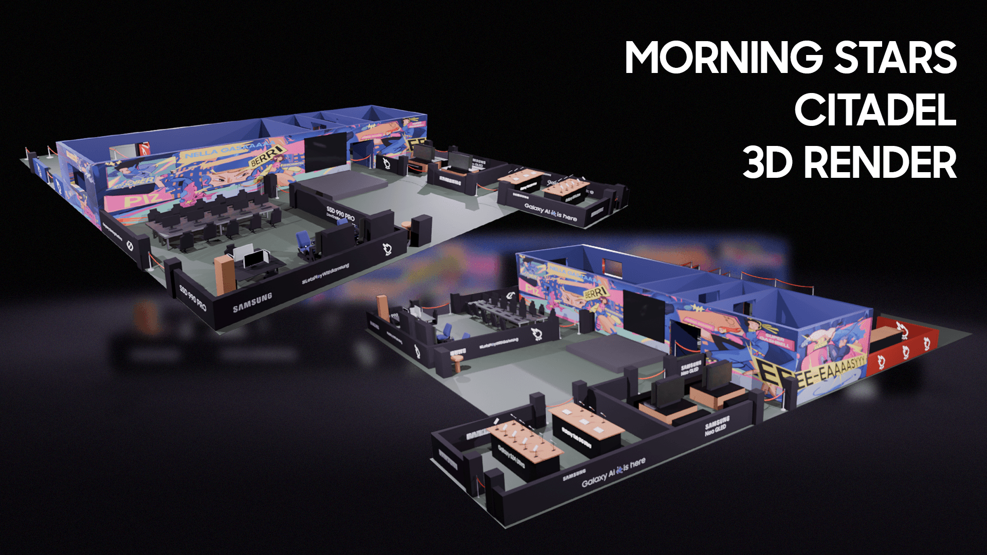 The challenge was to create a visually impactful stand identity that could stand out in a crowded event environment while clearly defining two connected but distinct spaces: the Morning Stars Citadel, dedicated to activities between creators and the gaming community around Samsung devices, and the Dive lounge, designed for Dive creators. The visual direction needed to feel bold, engaging, and recognizable across both physical space and social communication, while remaining aligned with Samsung’s presence and the overall event experience.
