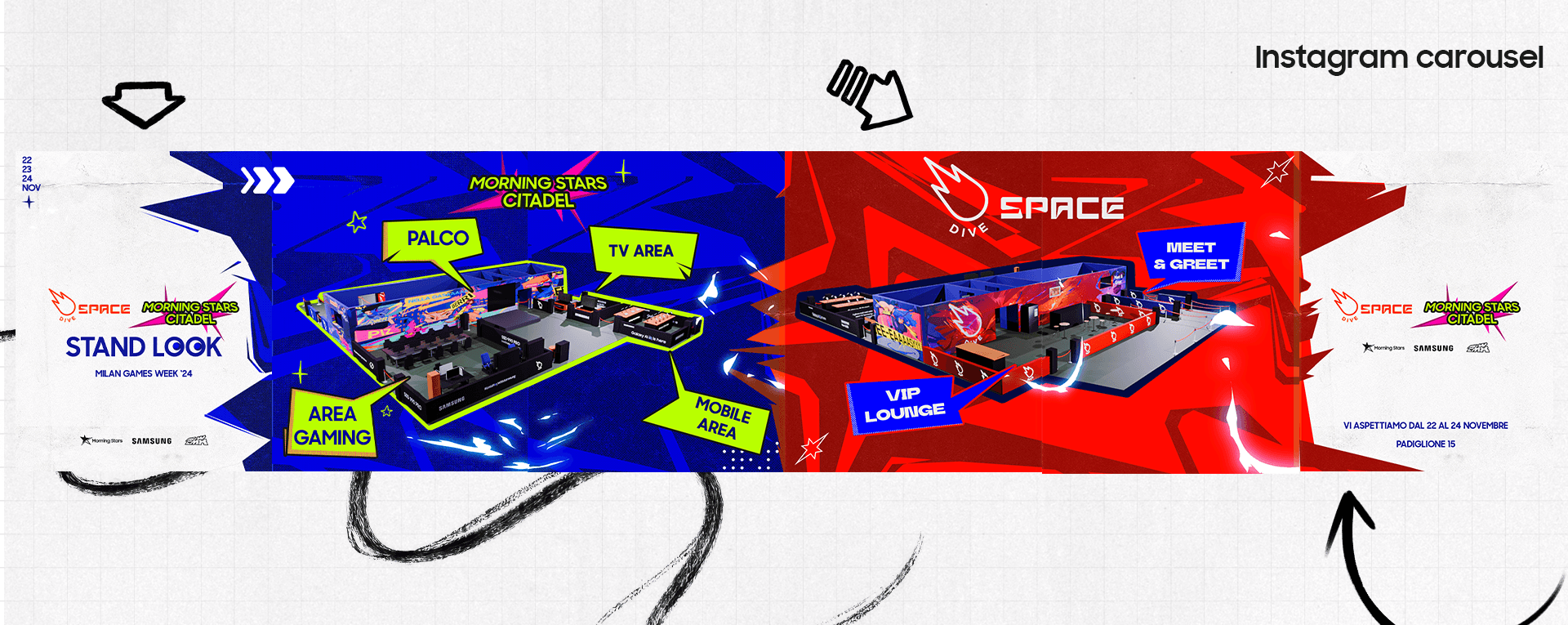 For Dive’s area, I designed a colorful space-inspired scene that connected back to the brand’s identity, echoing the visual language of Dive’s comet and creating a bold backdrop that could stand out within the fair. In parallel, I created digital assets and Instagram graphics for both Dive and Morning Stars, ensuring visual consistency between the stand, the event content, and the overall communication across social platforms.